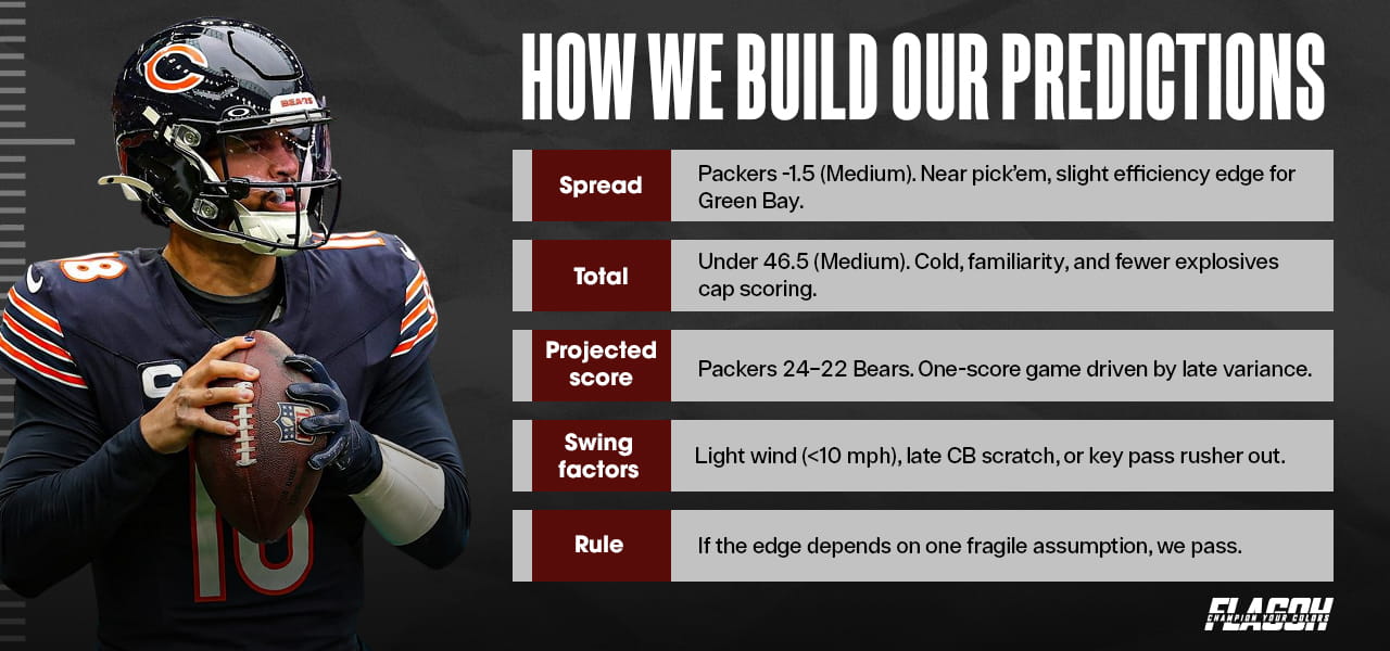 December at Soldier Field is a conditions game. These Green Bay vs Chicago predictions start with the market lean, validate it with drive efficiency, then use late wind and injury news to confirm (or flip) the bet—the same structured approach FlagOh uses for rivalry previews.