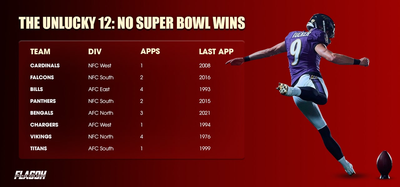 Quick takeaway: There are 12 teams with zero Super Bowl wins, and the Browns, Lions, Texans, and Jaguars have zero Super Bowl appearances.